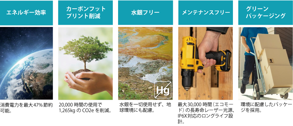 最大30,000時間(エコモード)の長寿命レーザー光源 - 水銀フリー、環境に配慮したサステナビリティ設計
