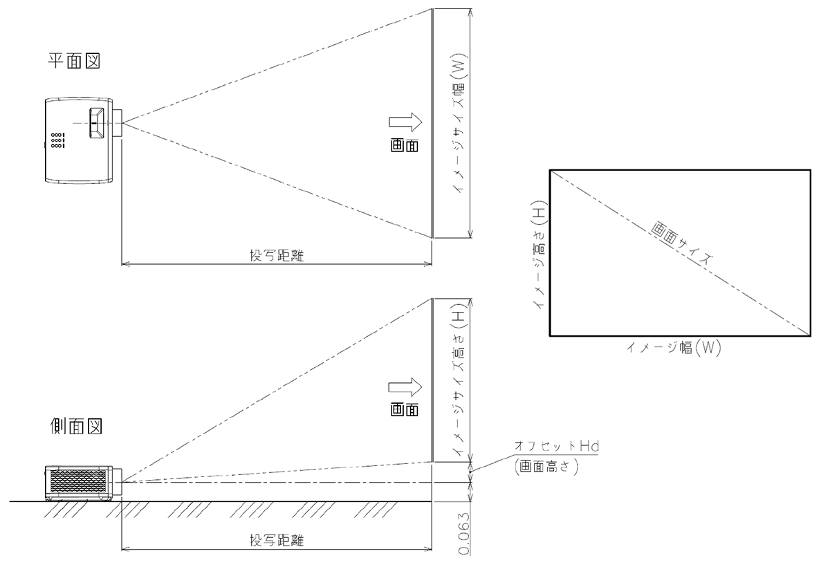 | 画面サイズ(型) | イメージサイズ(m) | 投写距離(m) ※1 | オフセット(m) | ||