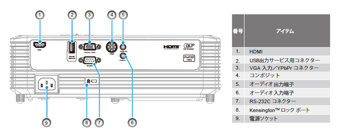 | 入力端子 | HDMI×1、VGA×1、オーディオ入力x1 |