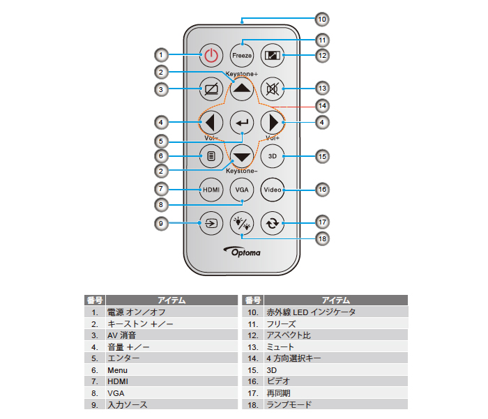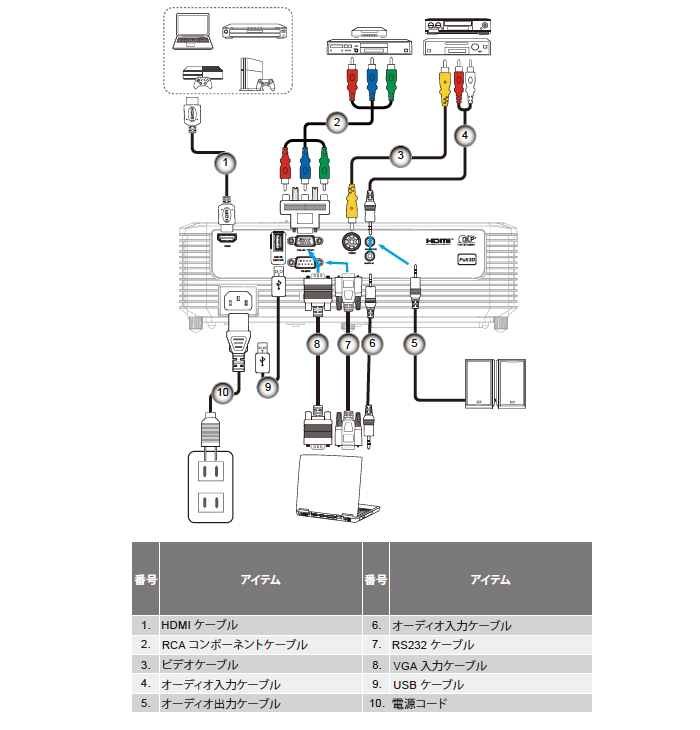 | 付属品 | 電源コード、リモコン、リチウムボタン電池(CR2025タイプ)、VGAケーブル、キャリングケース、安全上の注意(保証書付) |