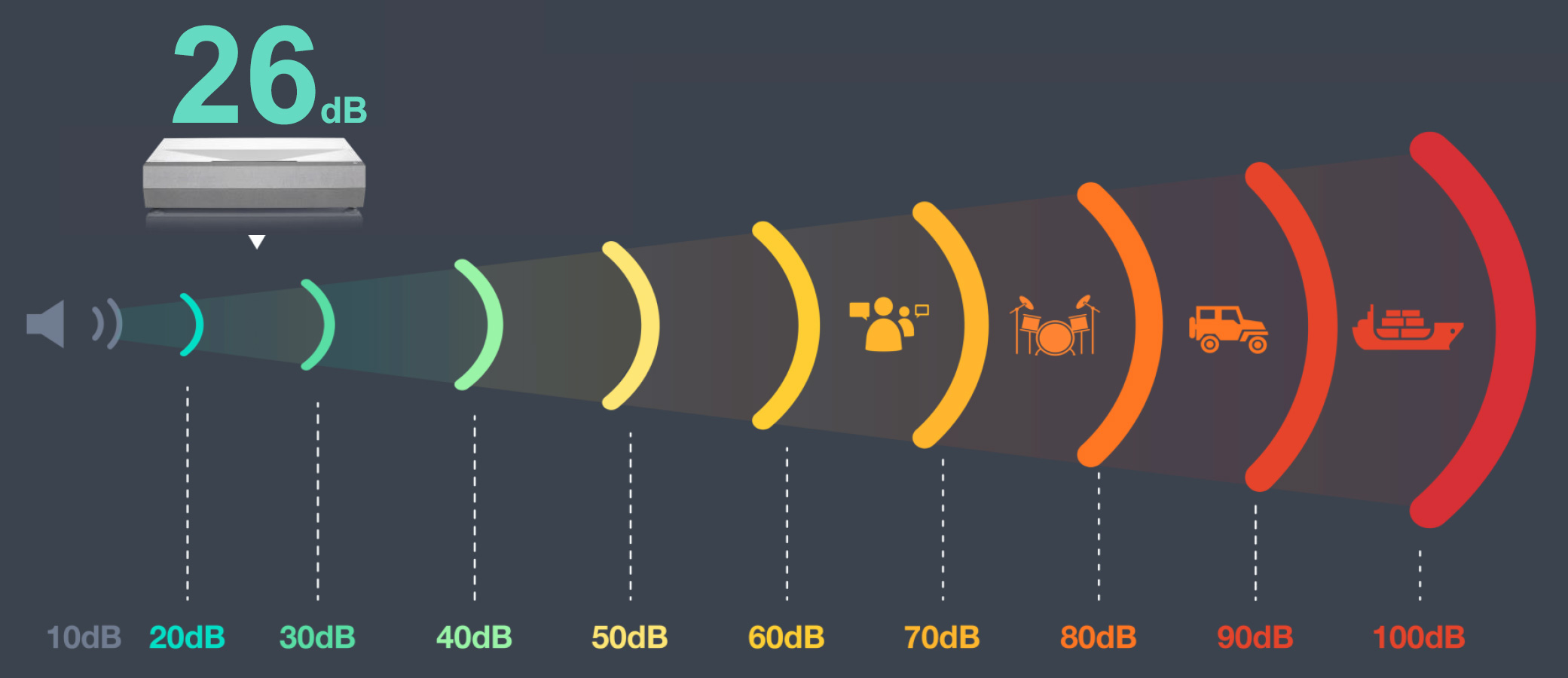 26dB(エコモード)と非常に小さな駆動音は、Optoma G1が作り出すビジュアル、サウンドの世界に心地よく浸ることができます。