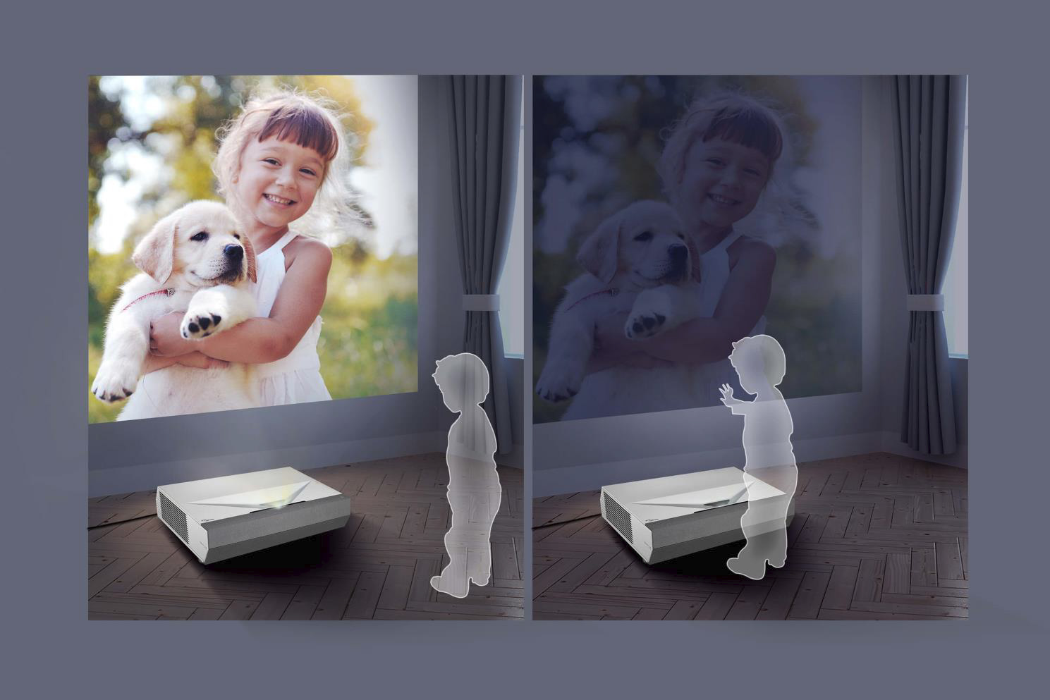 Optoma G1に近づくと、人感センサーが反応し自動的にレーザー光の明るさを自動的に減光し、目を保護する安全性に配慮した設計です。