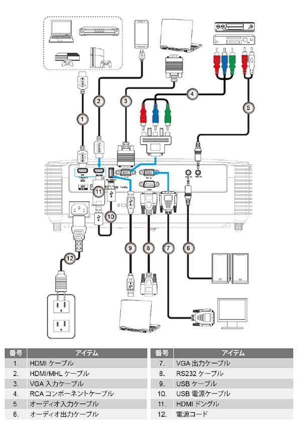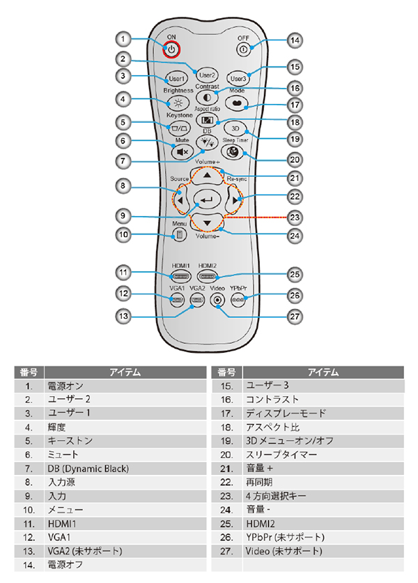 | 入力端子 | HDMI(v2.0、HDPC v2.2)×1、HDMI/MHL(v1.4 HDPC v2.2)×1、VGA×1、オーディオ(3.5mmジャック)×1 |