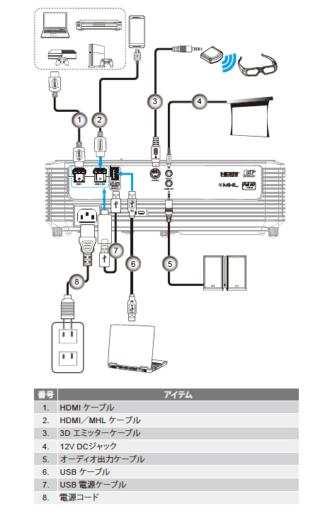 | 出力端子 | オーディオ(3.5mmジャック)×1、3Dシンクロ×1、USB電源(5V/12A)×1、トリガー(12V)×1 |