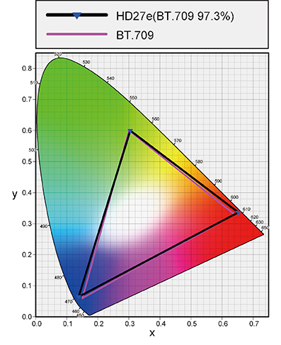HD27eは、BT.709の色域の約97%を表示できる、豊かな映像再現性を持ちます。