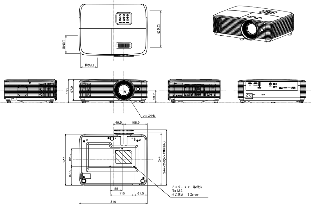 | 投写レンズ | F=2.1~2.31、f=16.901~20.608mm、1.1倍 |