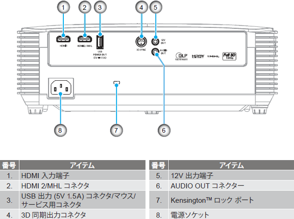 | 出力端子 | オーディオ(3.5mmジャック)×1、3Dシンクロ×1、トリガー(12V)×1、USB電源(5V/1.5A)×1 |