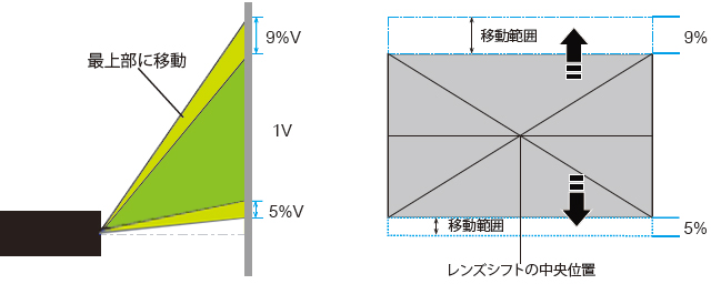 レンズシフト機能を使用すると、イメージ位置をディスプレイから上方に9%まで、または下方に5%の角度まで調整することができます。