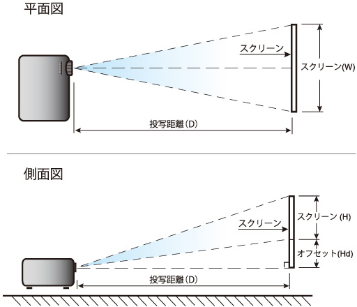 | 画面サイズ(型) | イメージサイズ(W×H)m | 投写距離(D)m | オフセット (Hd)m |