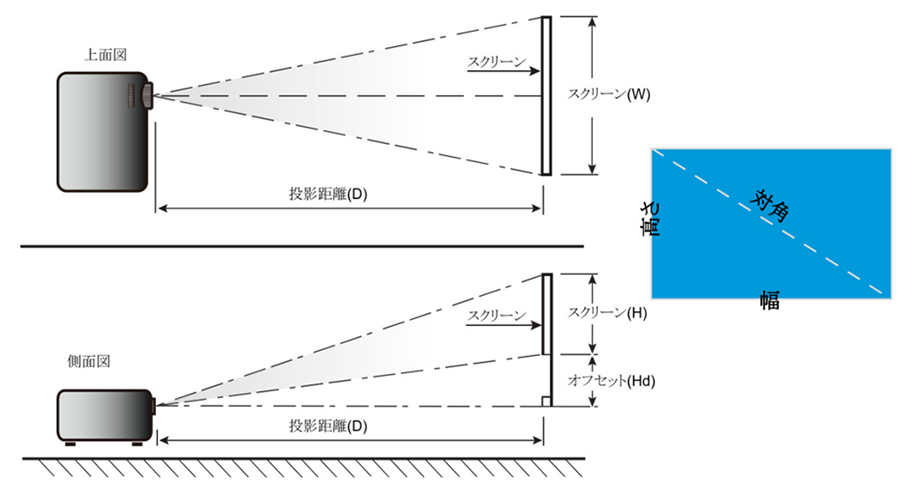 ※アスペクトHD(16:9)映写時の距離です。投写距離は実際の距離と誤差のある場合があります。(許容誤差±5%)