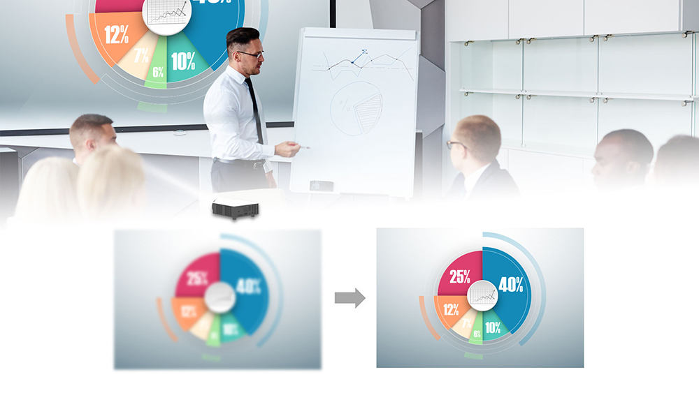 プレゼンテーションやミーティングシーンのビジネス用途まで、様々なシーンで大活躍。 - オートフォーカス、自動台形補正、LED3万時間など、クラス最高峰の性能。