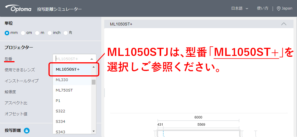 投写距離シミュレーター