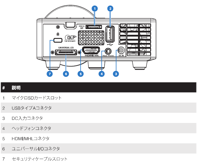 | 入力端子 | HDMI(MHL)×1、ユニバーサル I/O(VGA入力)×1、microSDカードスロット×1、USB(タイプA)×1 |