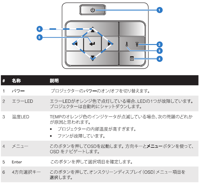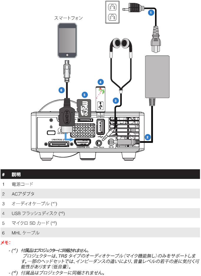 | 付属品 | 電源コード、ACアダプター、ユニバーサル 24ピン VGAケーブル、MHLケーブル、リモコン、リチウムボタン電池 (CR2025タイプ)、キャリングケース、取扱説明書(保証書付) |