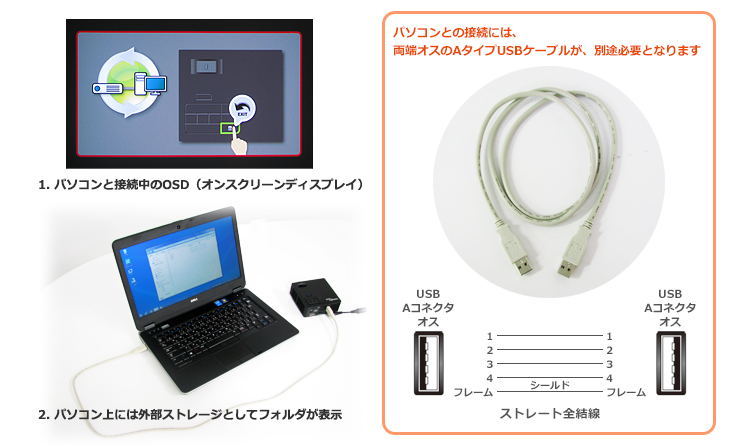 本体内部に1.5GBのメモリーを搭載し、本体とパソコンをUSBケーブルで接続すると外部ストレージとして認識します。