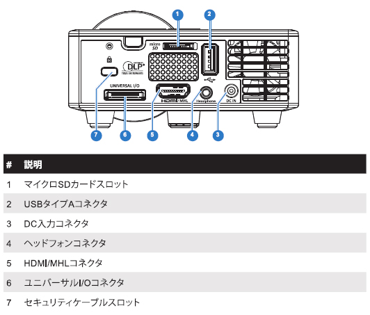 | 入力端子 | HDMI(MHL)×1、ユニバーサル I/O(VGA入力)×1、microSDカードスロット×1、USB(タイプA)×1 |