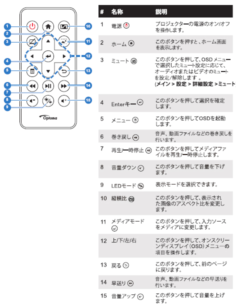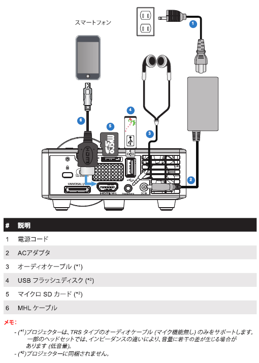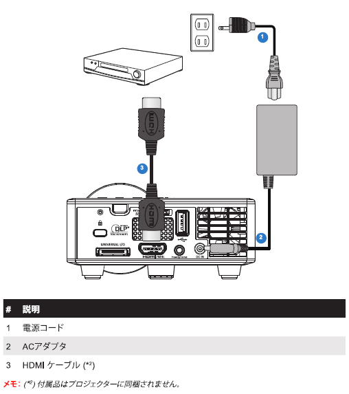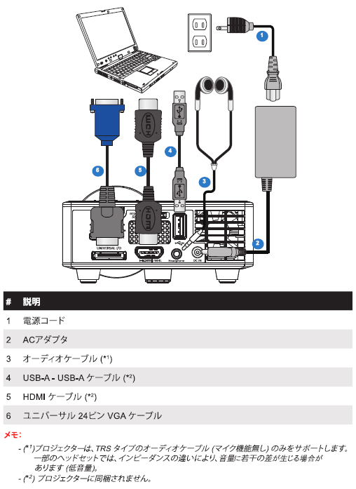 | 付属品 | 電源コード、ACアダプター、ユニバーサル 24ピン VGAケーブル、MHLケーブル、リモコン、リチウムボタン電池(CR2025タイプ)、キャリングケース、取扱説明書(保証書付)、HDCastPro専用Wi-Fiドングル、HDCastPro取扱説明書、ベイシックユーザーマニュアル |