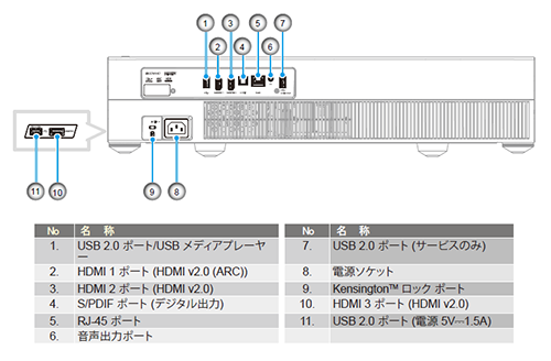 | 入力端子 | HDMI(V2.0 HDCP2.2 最大4K HDR(3840x2160)/60fps) ×2、HDMI(V1.4) ×1 USB(サービス) ×1、USB(MM) ×1 |
