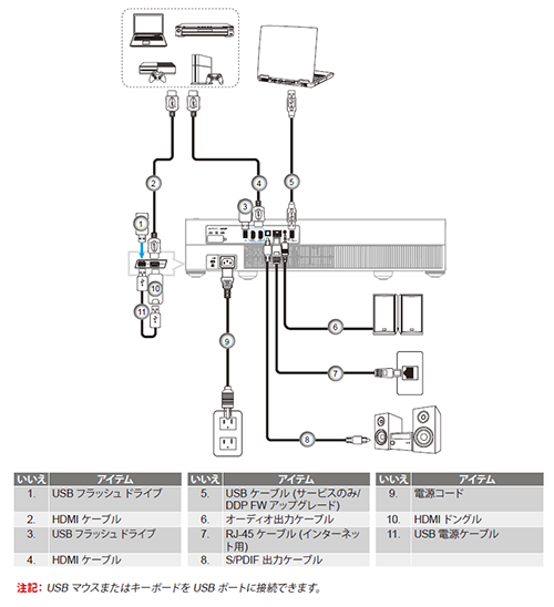| 付属品 | リモコン、電源コード、マイクロUSBケーブル、フットスペーサ、距離カード、取扱説明書(保証書付) |