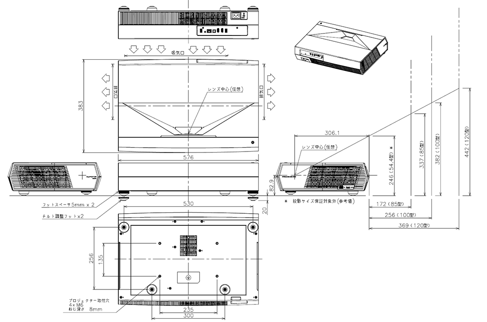 | 投写距離 | 0.172m(85型)~0.369m(120型)※3 |