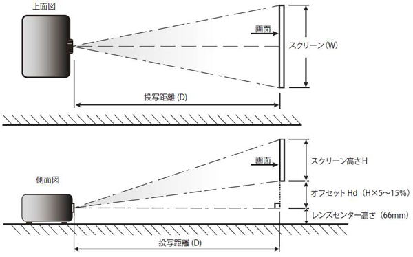 | 画面サイズ(型) | イメージサイズ m | 投写距離(D) m | オフセット(Hd)m | |||