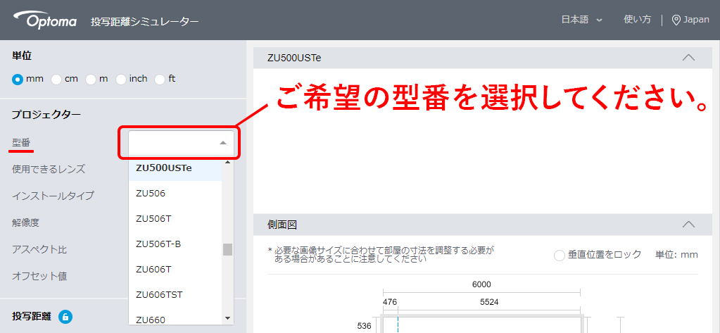 ※アスペクト4K・FHD(16:9)映写時の距離です。投写距離は実際の距離と誤差のある場合があります。(許容誤差±5%)