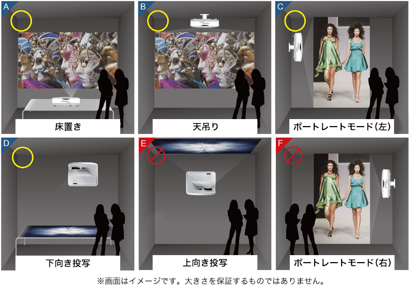 - 天吊り、ポートレート、下向きでの投写も可能(投写可能位置の説明図はコチラ)
