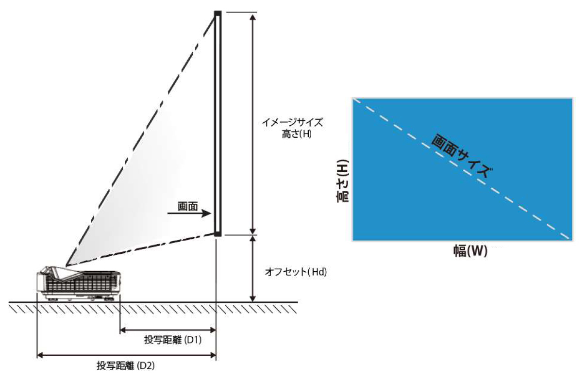 | 画面サイズ(型) | イメージサイズm | 投写距離m | オフセットm | ||