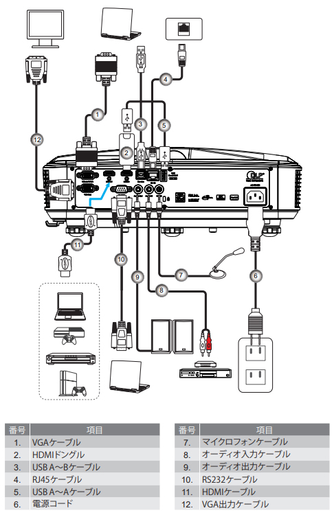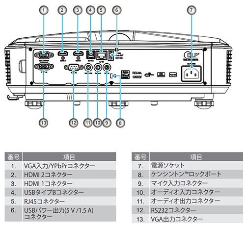 | 入力端子 | HDMI(V2.0 HDCP2.0 最大4K HDR(3840x2160)/60fps) ×2、VGA IN ×1、オーディオ(3.5mmジャック)×1、マイク(3.5mmジャック) ×1 |