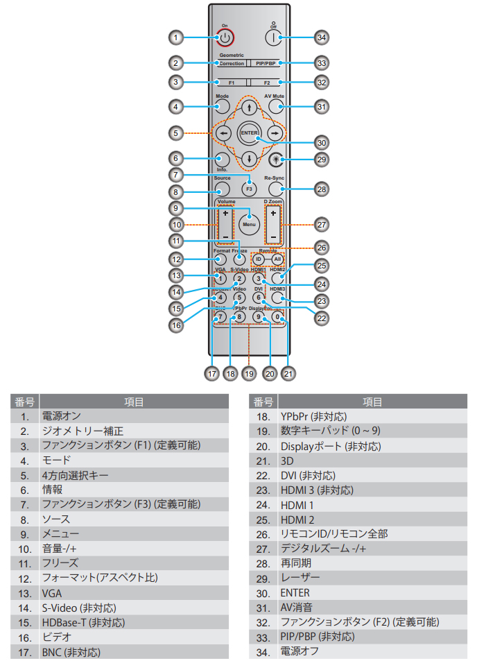 | コンピューター信号 | 4K UHD(3840 x 2160)、FHD、HD、UXGA、SXGA+、SXGA、XGA、SVGA、VGA |