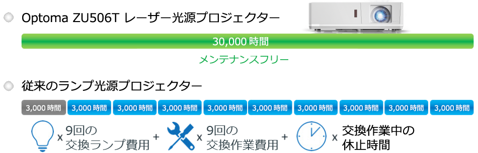 エコモードで最大30,000時間の光源寿命は、メンテナンスフリーでビジネス用途に理想的です。