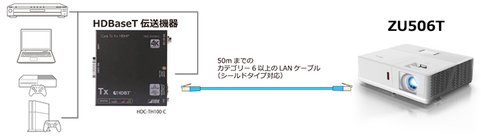 ZU506TはHDBaseTを標準搭載しています。50mまでのLANケーブル・CAT6以上を使用し、非圧縮・無加工の画質劣化のない動画を送信でき、遠方からの制御を必要とする環境に対応します。