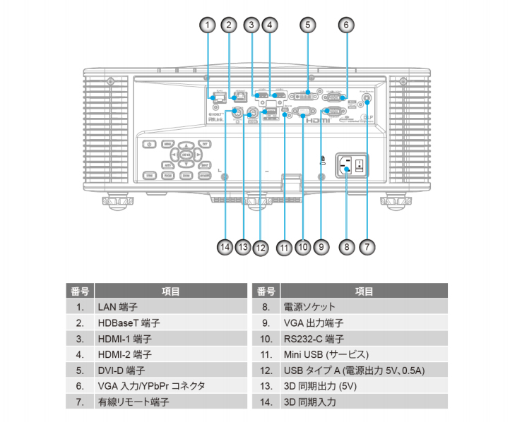 | 出力端子 | VGA(YPbPr)×1、3Dシンクロ×1、USB電源(0.5A)×1、トリガー(12V)×1 |