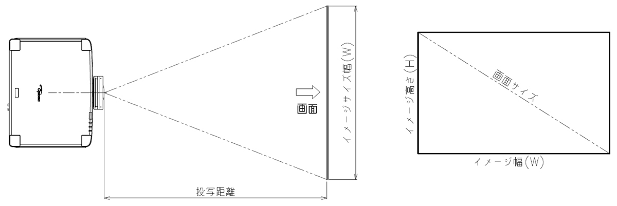 イメージサイズm | プロジェクターの距離m ※1 | オフセットm(最短時)※2 レンズ芯からイメージ下端 |
