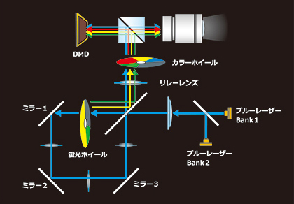 青色レーザーの光を蛍光ホイールで分色し、さらにカラーホイールが赤色を分色するとともに色純度を上げる働きをしています。 RGBに黄色を加えたカラーパレットは、より豊かな色彩を生み出し、水銀ランプ方式の約120%の広い色域が実現しました。