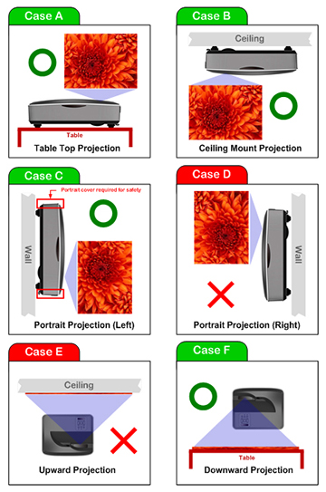 - レーザー光源採用のため、天吊りはもちろん 縦位置投写も可能(投写可能位置の説明図はコチラ)