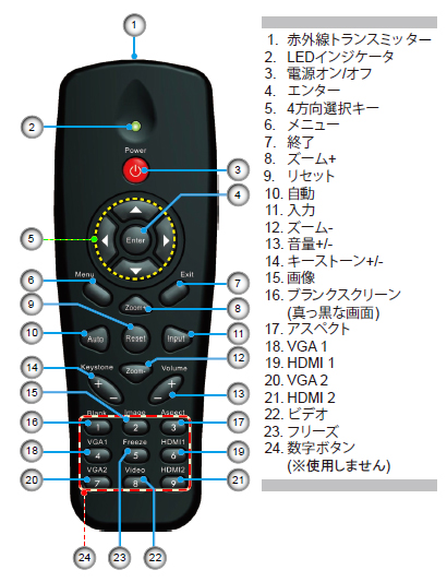 | 付属品 | 電源コード、VGAケーブル、リモコン、単4電池×2、取扱説明書(保証書付)、ベーシックユーザーマニュアル |