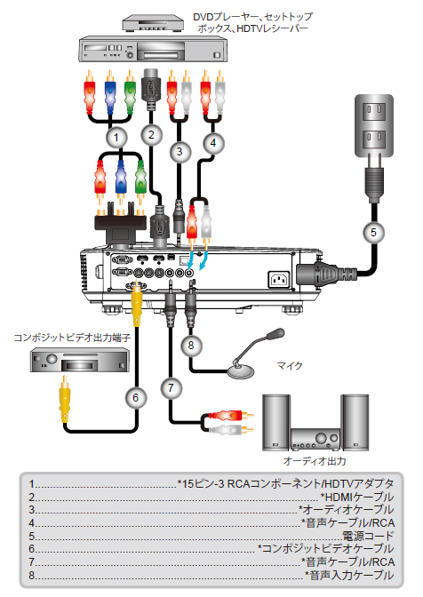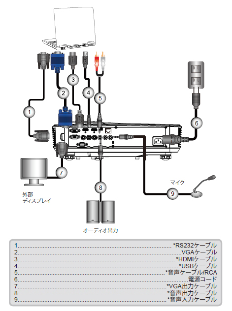 | 入力端子 | HDMI×2、VGA(YPbPr)×2、コンポジット×1、オーディオ(3.5mmステレオジャック)×1、RCAオーディオ×1、マイク(3.5mmステレオジャック)×1 |