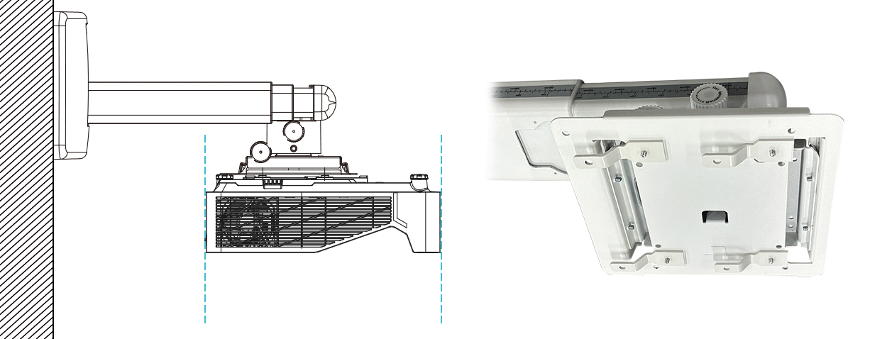 W340USTの投射距離を確認して設置高さの設定をしてください。※W340UST単体のレンズセンターオフセットは62.5mmになります。