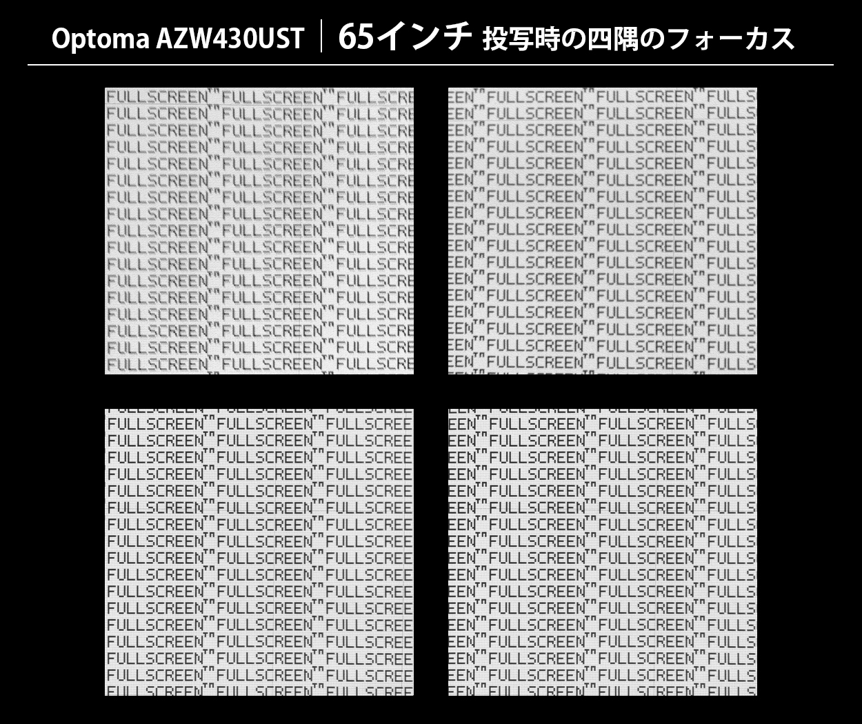 以下に、参考として80インチ(16:10)サイズで実際に投写した各四隅の画像写真を掲載します。