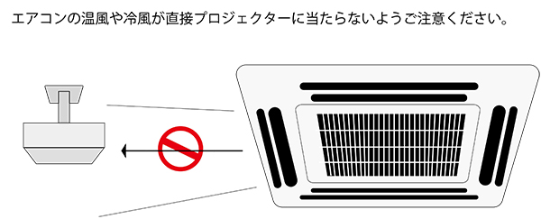 温風や冷風が直接プロジェクターあたることで、トラブルになる場合がございます。
